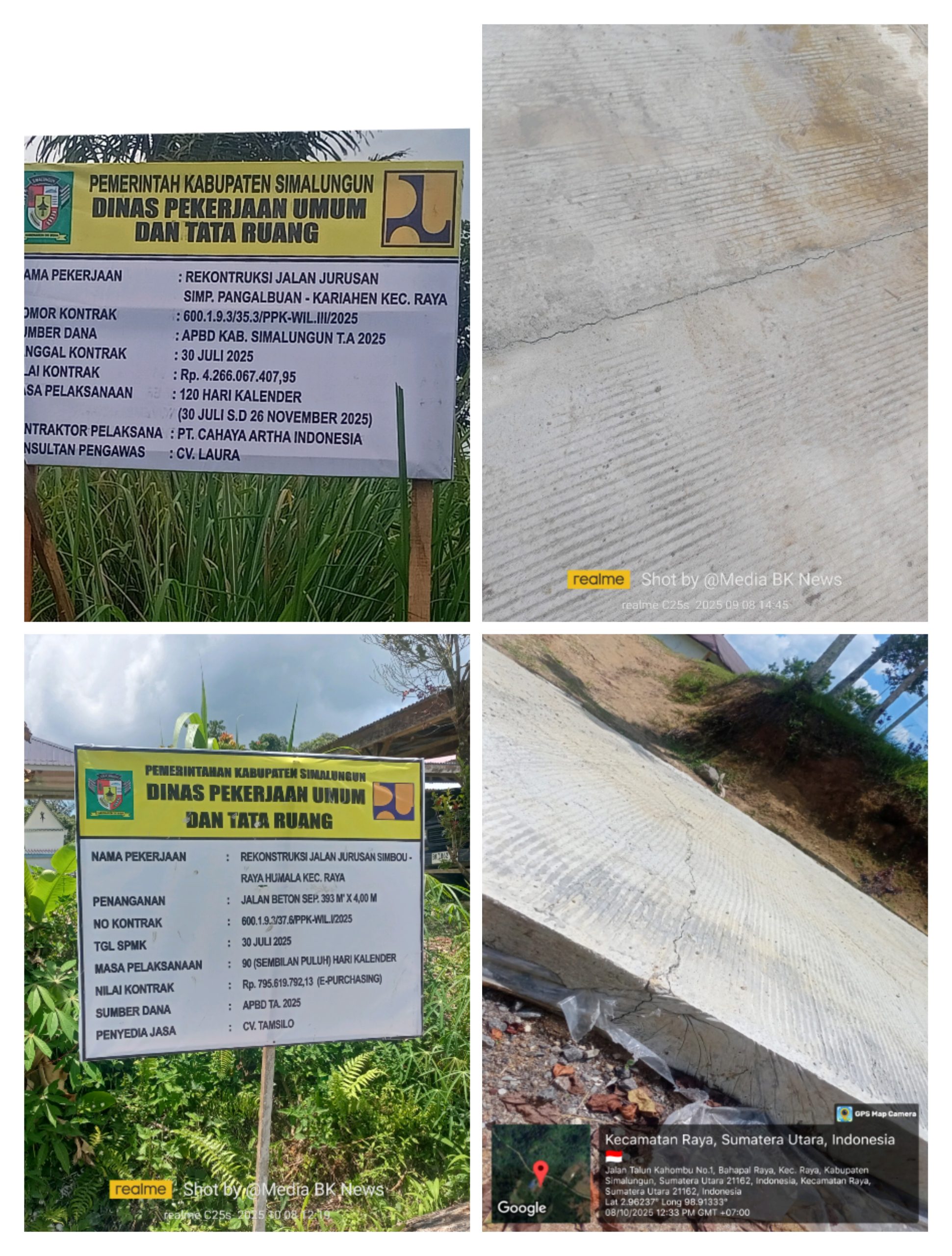 Dalam kunjungan tim media ke lokasi, ditemukan beberapa proyek rekonstruksi jalan yang terindikasi tidak memenuhi standar. Di antaranya adalah rekonstruksi Jalan Jurusan Simbou – Raya Humala, yang menggunakan anggaran mencapai Rp. 795.619.792,13, dikerjakan oleh CV. Tamsilo. Selain itu, untuk rekonstruksi Jalan Simp. Sigondrang – Silau Huluan, dengan anggaran Rp. 1.497.730.323, ditangani oleh CV. INTEK JPK. Terakhir, ada juga proyek rekonstruksi Jalan Emplasemen Marjandi – Raya Bosi, yang menghabiskan anggaran Rp. 997.975.107, dikelola oleh CV. K.S Putra Simalungun.